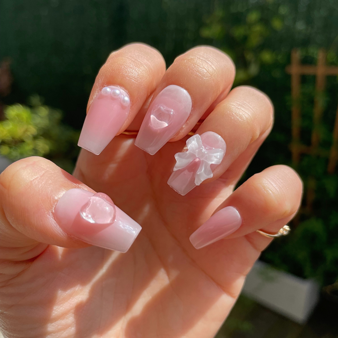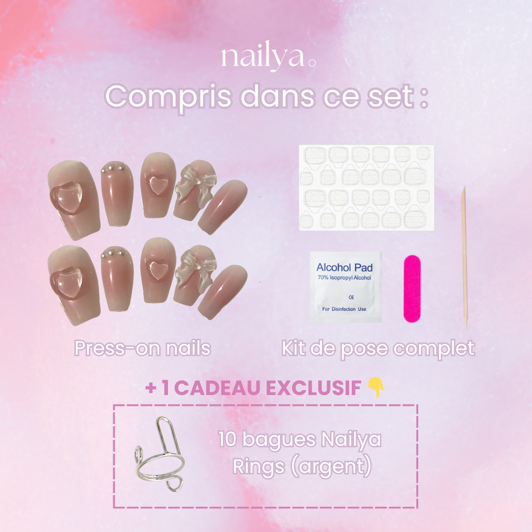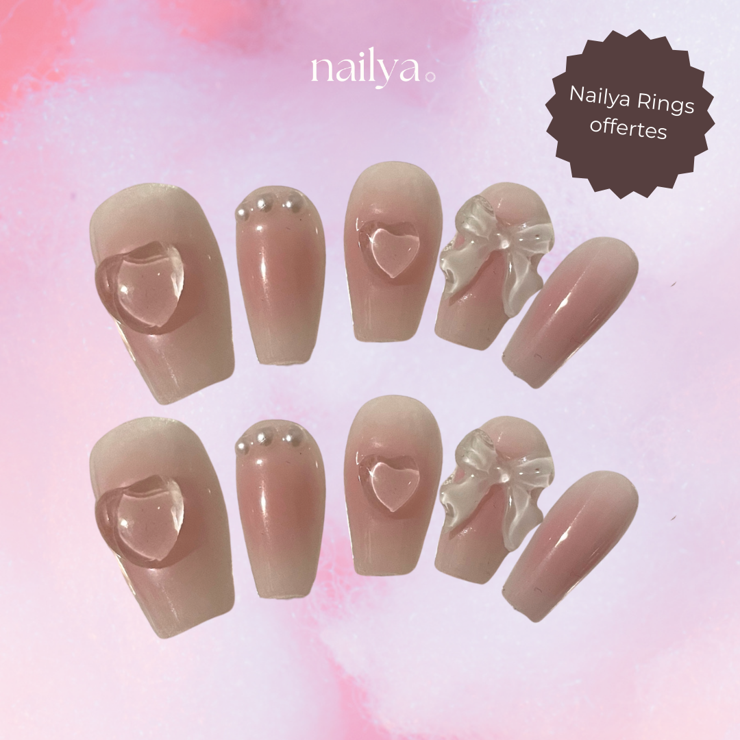 Sublimez vos ongles avec notre set de press-on nails fait main "Coquette", issu de la collection été 2025 Nailya. Une manucure inspirée de l’esthétique douce et romantique de la tendance "coquette", pour des mains gracieuses et ultra girly. Idéale pour celles qui aiment exprimer leur féminité avec subtilité et raffinement !