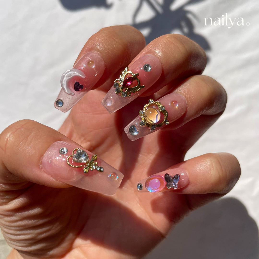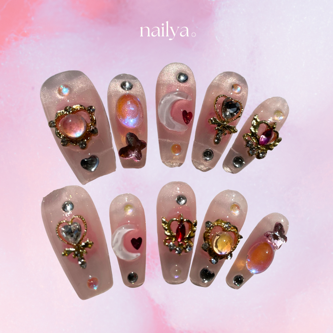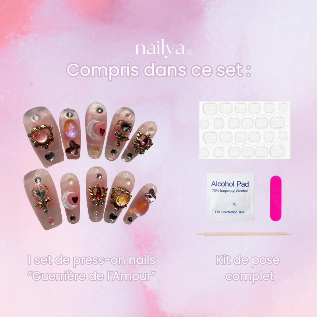 Incarnez la puissance féminine avec douceur et magie grâce à notre set de press-on nails fait main "Guerrière de l’Amour", issu de la collection été 2025 Nailya. Un design ultra kawaii inspiré de l’univers des magical girls, mêlant symboles lunaires, cœurs précieux et ornements royaux. Idéal pour affirmer votre style avec tendresse, force et éclat !