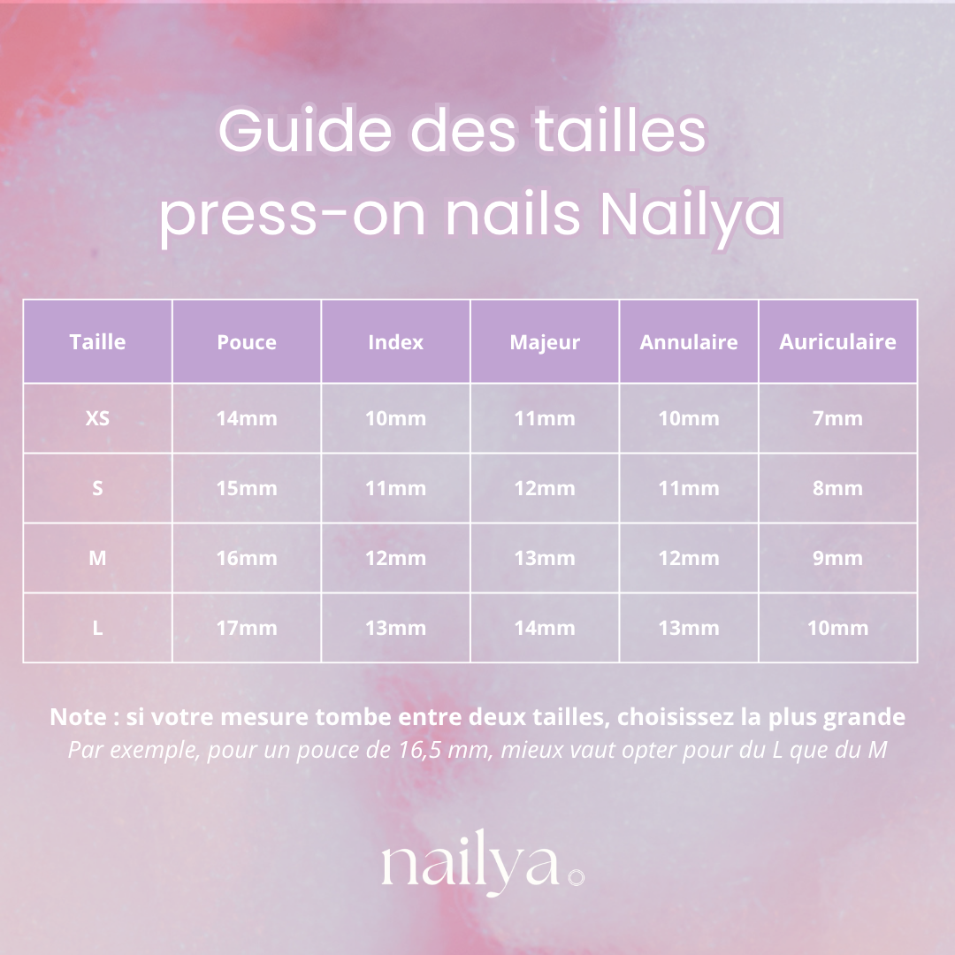 Retrouvez notre guide complet, du choix de la taille, en passant par la pose jusqu'au retrait des press-on nails, juste ici