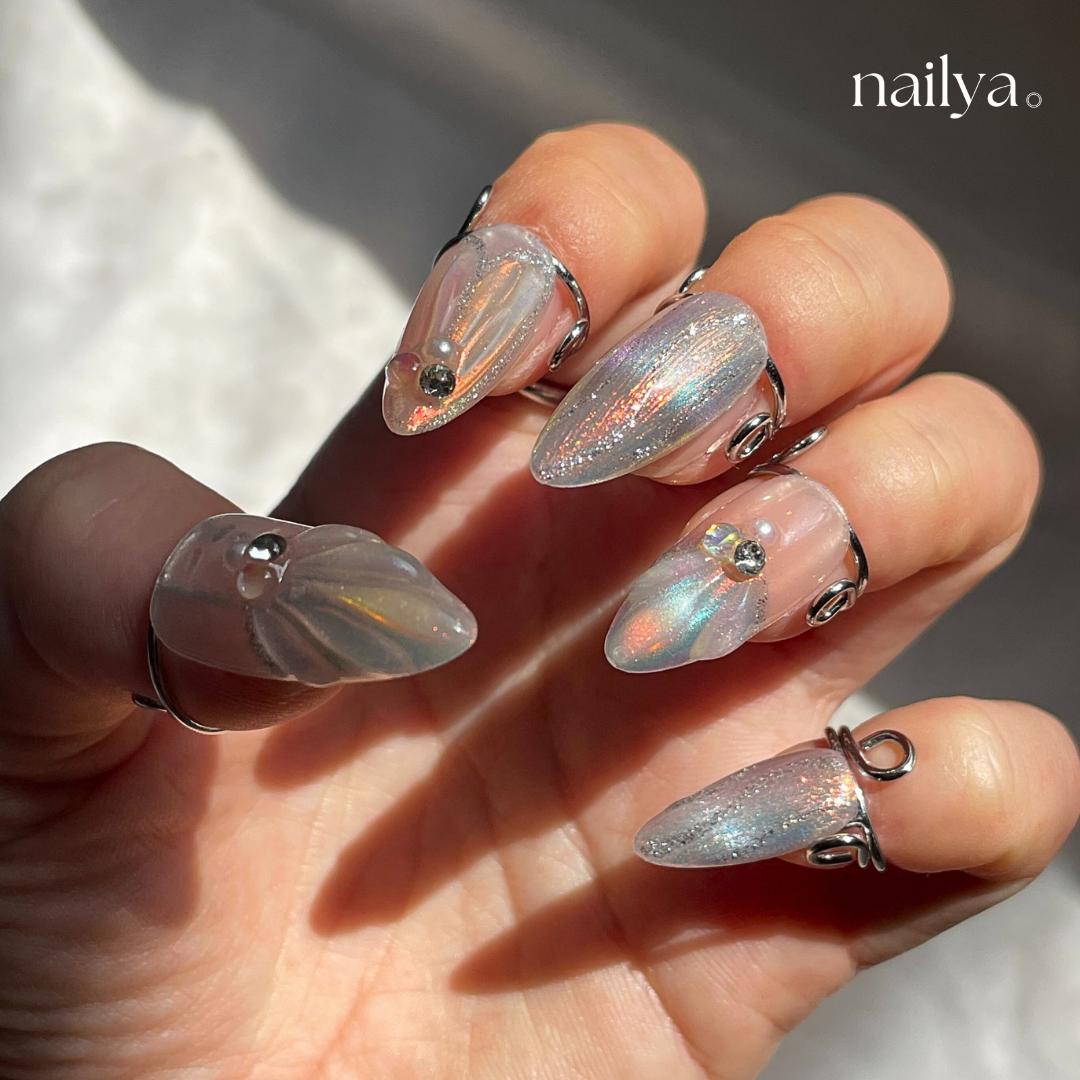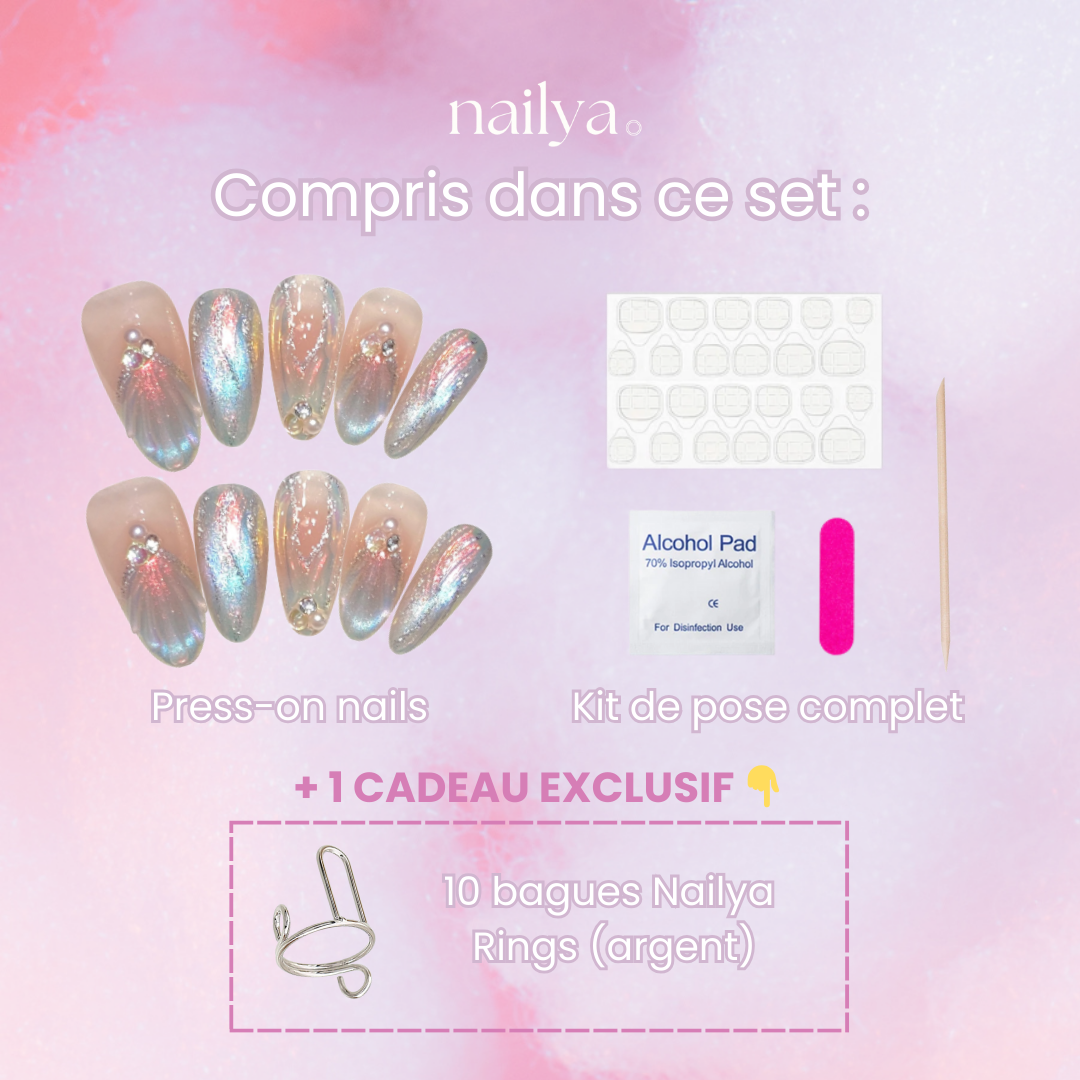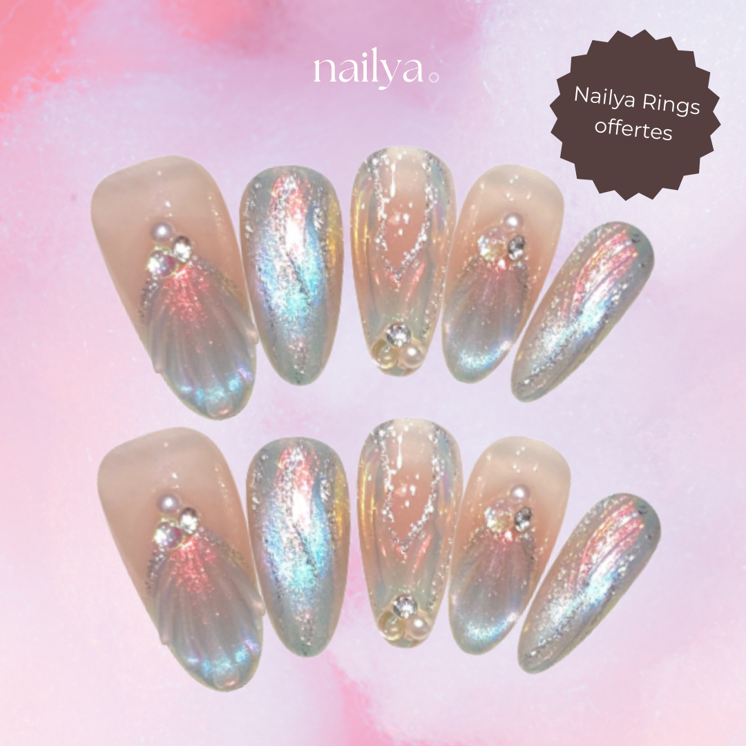 Plongez dans un univers féerique avec notre set de press-on nails fait main "Princesse des Océans", issu de la collection été 2025 Nailya. Une création hypnotisante, inspirée des reflets marins, parfaite pour sublimer vos tenues estivales !